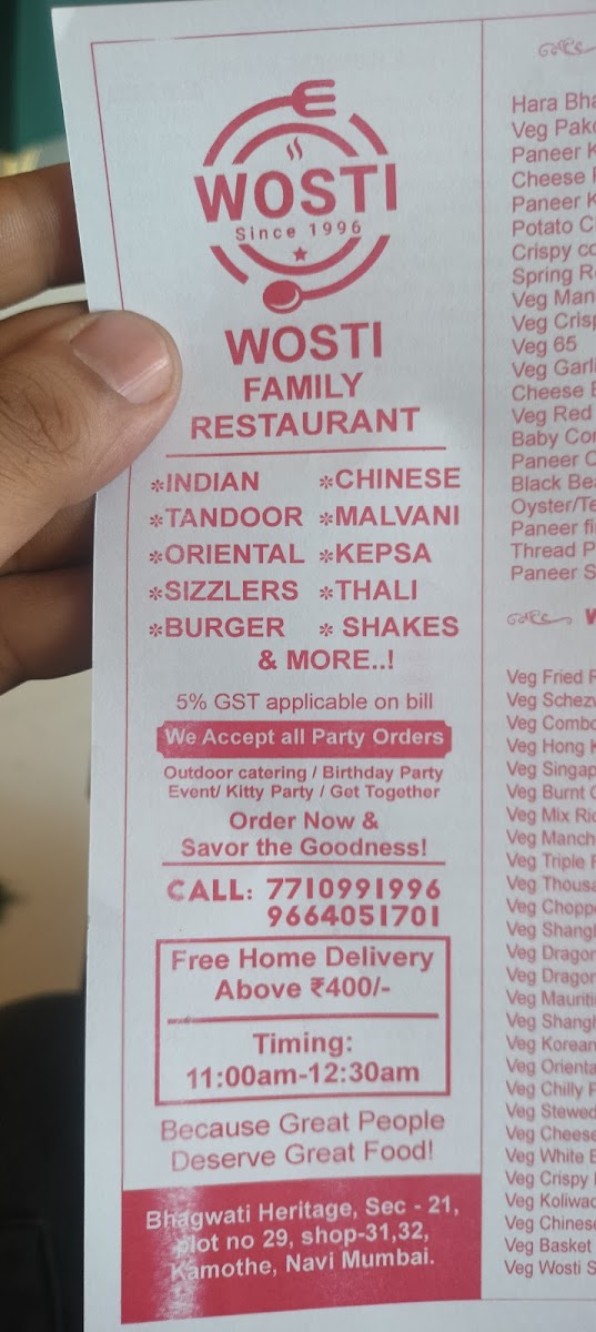 Welcome to Wosti Multi Cuisine Family Restaurant, a delightful culinary haven located in Kamothe, Navi Mumbai. This family-run establishment offers an extensive menu that tantalizes your taste buds with a diverse range of Indian flavors.